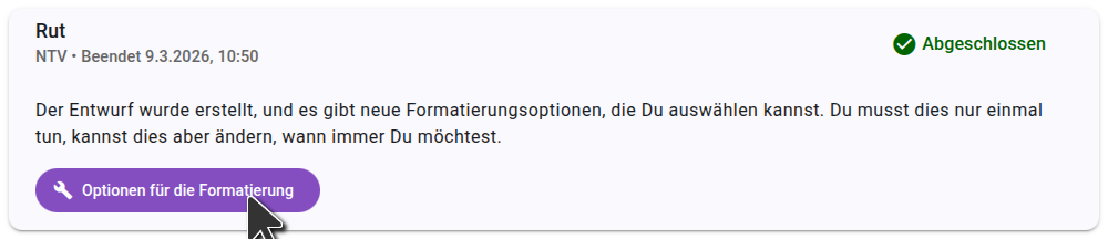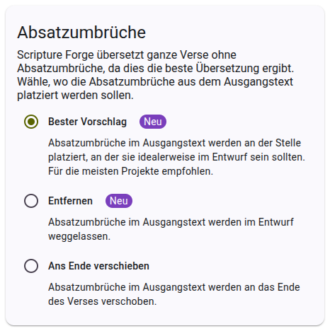 Nach dem Generieren eines Entwurfs in Scripture Forge musst Du die Formatierungsoptionen auswählen. Diese Optionen steuern, wie Scripture Forge den Entwurfstext formatiert.