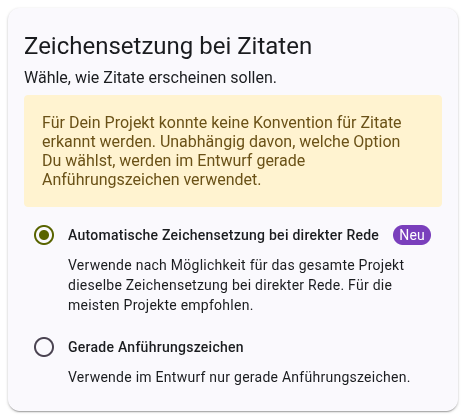 Es gibt zwei Optionen für den Zitierstil. Die Standardeinstellung ist "Automatisch", was für die meisten Projekte empfohlen wird. Wenn Du eine Option auswählst, wird rechts auf der Seite eine Vorschau angezeigt, damit Du weist, wie sich die Optionen auf die Formatierung Deines Entwurfs auswirken.
