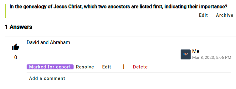 Um Antworten von Überprüfern der Zielgruppe zu sehen, klicke auf eines der Bücher unter Überprüfung mit der Zielgruppe in der Navigationsleiste. Dann klicke auf eine Frage, um die Antworten zu sehen, die gegeben wurden. Wenn Du eine Antwort nach Paratext exportieren möchtest, klicke auf Für Export markieren für diese Antwort. Wenn Du mit der Antwort nichts weiter tun möchtest, klicke auf Erledigt. Damit wird die Antwort nicht entfernt, aber sie so markiert, dass keine weiteren Maßnahmen erforderlich sind.