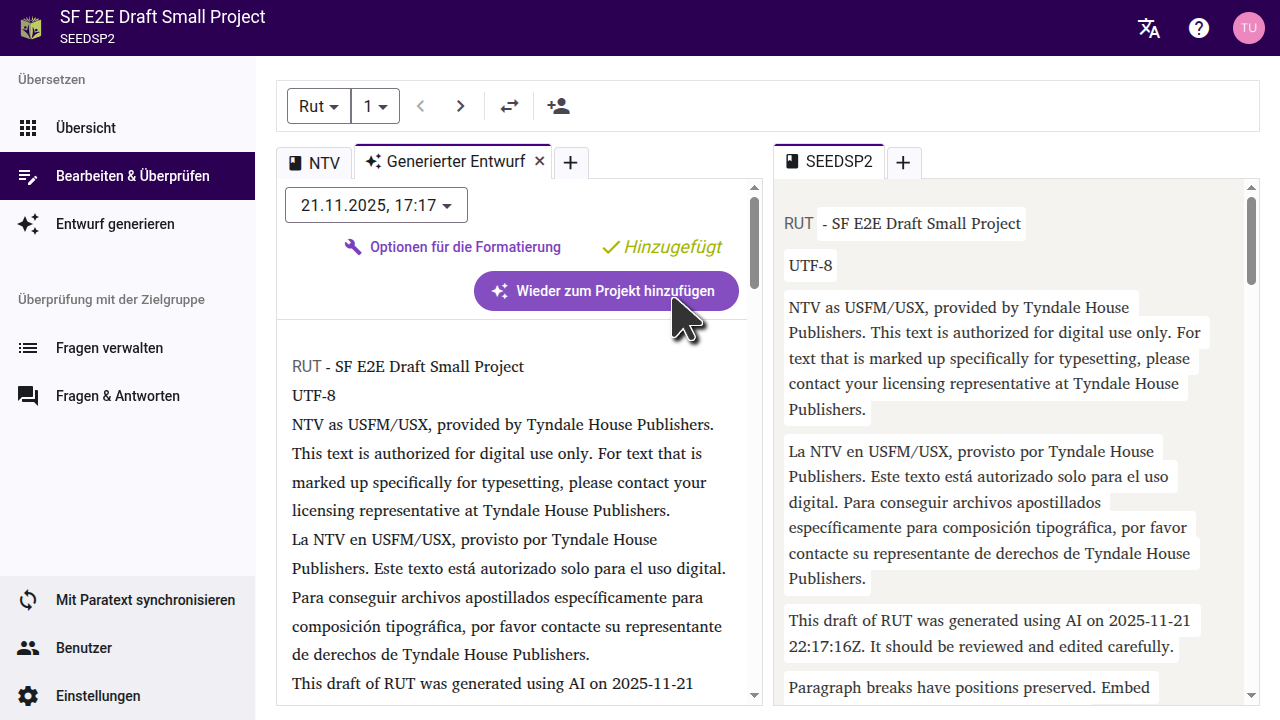 Falls Du den Entwurf eines Buches generiert hast, dessen Übersetzung das Team bereits fertig übersetzt hat, kannst Du die Registerkarte "Entwurf" auf die andere Seite der Seite verschieben und sie mit der Übersetzung des Teams vergleichen.