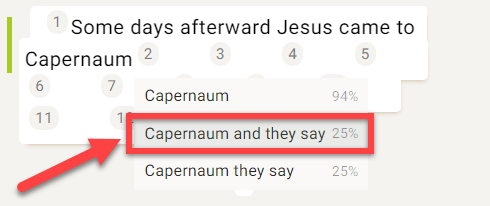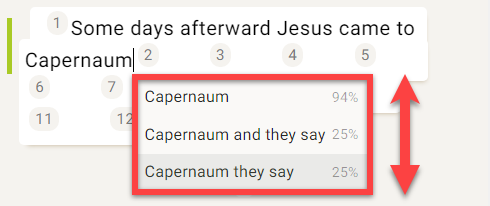 Cuando Scripture Forge le muestre sugerencias de traducción, puede utilizar las teclas de flecha arriba y abajo para resaltar la sugerencia que desee.