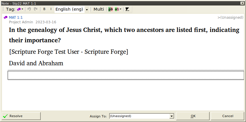 Pour afficher les réponses des vérificateurs de la communauté, cliquez sur l'un des livres dans la section Vérification par la communauté dans la barre latérale de navigation. Cliquez ensuite sur une question pour voir les réponses qui ont été données. Si vous souhaitez qu'une réponse soit exportée vers Paratext, cliquez sur Marquer pour l'exportation sur cette réponse. Si vous ne voulez rien faire d'autre avec la réponse, cliquez sur Résoudre. Cela ne supprime pas la réponse, mais la marque comme ne nécessitant pas d'autre action.