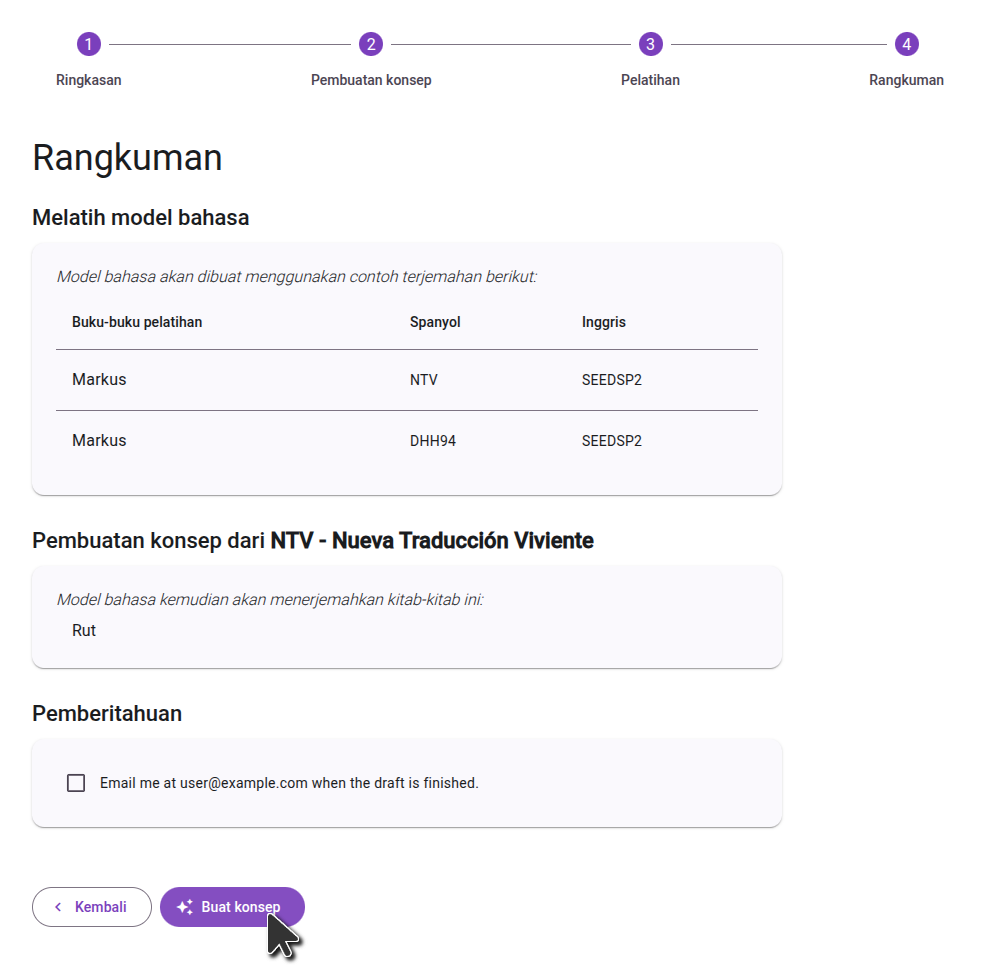 On the second step, select the books you want translated. If the book you want to draft does not exist in your Paratext project, you will need to create the book in Paratext first. In general we suggest drafting one book at a time, though if you are drafting smaller books, you may want to draft several at a time.