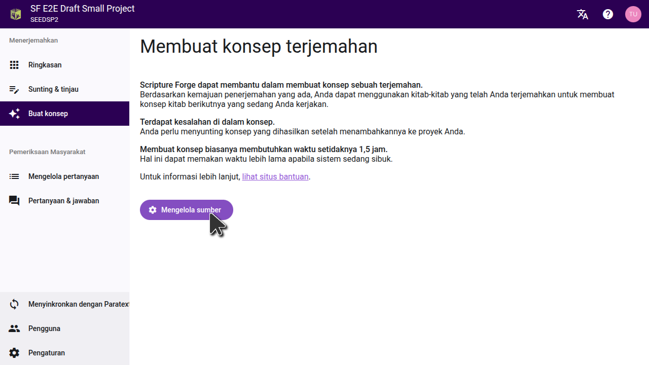 If you created a separate Paratext project just to store generated drafts, make sure you sign up from your main translation project. Do not sign up from the storage project. Drafts can be saved in another project, but they must be generated from your main project so the model learns from your completed translation work.