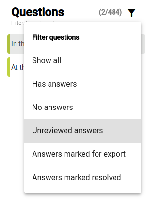 If you want to find answers that have not been marked for export, or marked resolved, use the filter above the list of questions to find Unreviewed answers.